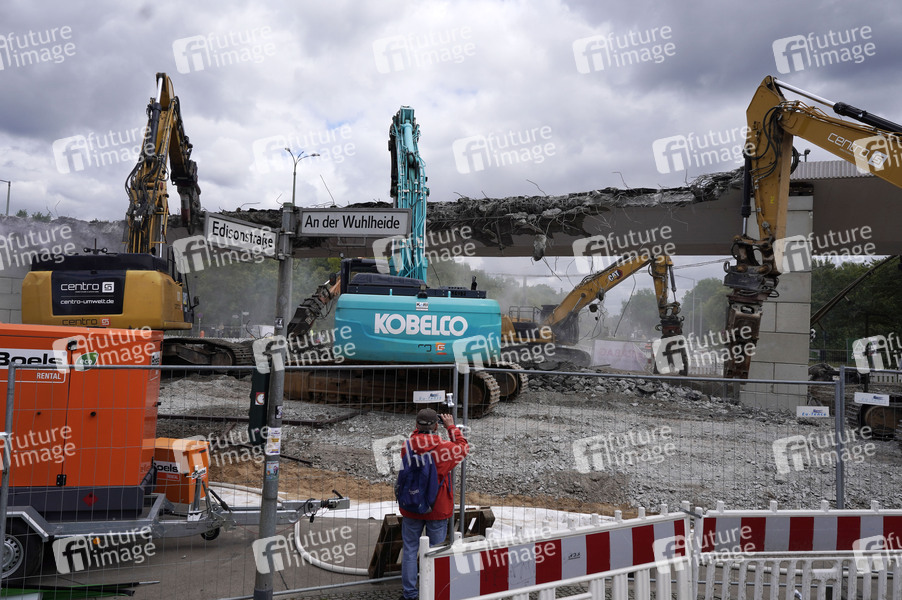 Der Abriss der maroden Brücke an der Wuhlheide (Oberschöneweide) geht zügig voran. Bereits am 2. Tag wird schon ein Teil der Brücke abgerissen. Die kaputte Brücke soll schnellstmöglich entfernt werden mit dem Ziel, die Freigabe der blockieren Straßenbahntrasse und Wiederherstellung des Fuß- und Radverkehrs zwischen Treskowallee und Edisonstraße möglichst bis zum 30. Mai. Berlin, 24.05.2025