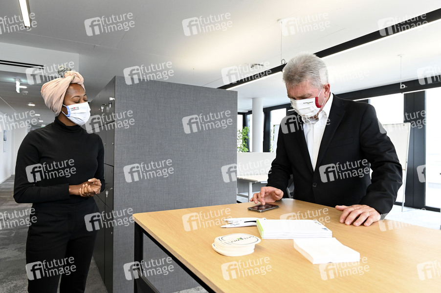 Maryline Ogboko und Andreas Pinkwart beim Besuch des Gateway Exzellenz Start-up Centers der Universität zu Köln. Köln, 04.06.2020