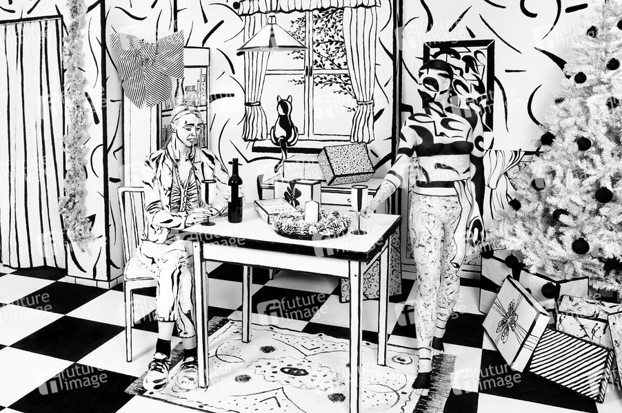 (Black and) White Christmas Photoshooting mit den Models Tina als Akteurin und Tatjana Heinz getarnt am Bilderrahmen im Atelier Düsterwald. Hameln, 08.12.2024 - Bodypainting und Kulisse von Jörg Düsterwald