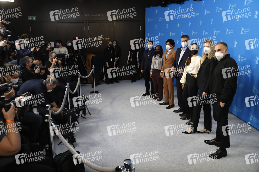 Ryusuke Hamaguchi, Tsitsi Dangarembga, M. Night Shyamalan, Said Ben Said, Anne Zohra Berrached, Connie Nielsen und Karim Ainouz beim Photocall der internationalen Jury auf der Berlinale 2022 / 72. Internationale Filmfestspiele Berlin im Hotel Grand Hyatt. Berlin, 10.02.2022