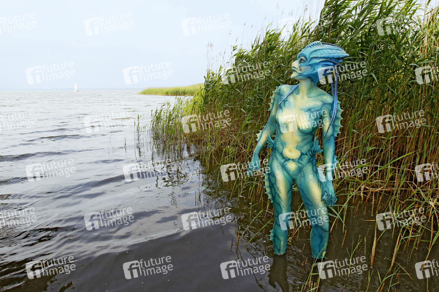 Bodypainting, Body-Painting, Erotik, Frau, Mädchen, nackt, Akt, weiblich, Körperkunst, Körperfarben, Farbe, Bemalung, Kunst, Malerei, Meer, See, Gewässer, Wasser, Monster, Ungeheuer, Fischwesen, Monster aus der Lagune, Schilf, Science Fiction, Sci-Fi, SciFi, Fantastic, Creature from the Black Lagoon, body painting, erotic, woman, girl, nude, female, body art, colors, sea, reed, lake, water, monster, fish being