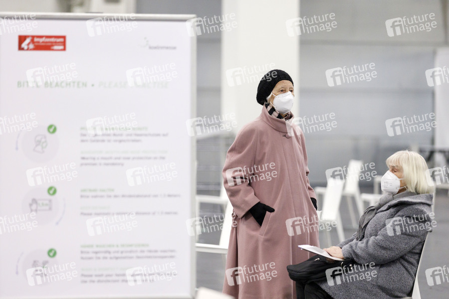 Das Kölner Impfzentrum in den Hallen der Koelnmesse hat eröffnet. Zuerst werden dort nun die Über-80-Jährigen geimpft – vorausgesetzt sie haben einen der Impftermine bekommen. Aufgrund der Verzögerung bei den Impfstoff-Lieferungen der Hersteller Biontech und Pfizer musste der Impfstart in NRW bis nun verschoben werden. Elisabeth Steubesand, mit 105 Jahren die älteste Kölnerin, war die erste Patientin, die im Impfzentrum ihre Impfung erhielt. (Themenbild, Symbolbild) Köln, 08.02.2021