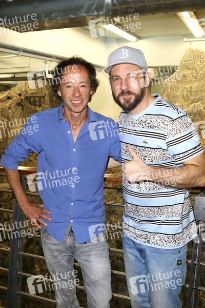 Gerrit Braun und Das Bo bei der Präsentation des offiziellen Musikvideos von Das Bo zur Fussball WM mit einem Liveauftritt im Modell von der Schweiz im Miniaturwunderland. Hamburg, 27.05.2014