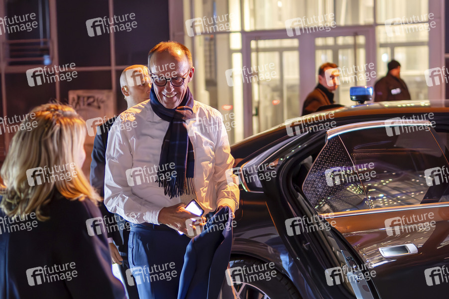 Friedrich Merz bei der Ankunft zur TV Diskussion 'Quadrell - Der große Wahlabend ' zum Bundestagswahlkampf 2025 am Studio Adlershof. Berlin, 16.02.2025