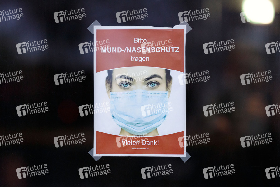Wegen der Corona-Pandemie haben sich Bund und Länder auf eine Verlängerung des Lockdown bis Mitte Februar geeinigt. Somit bleiben beispielsweise Restaurants, Kulturbetriebe und viele Geschäfte im Einzelhandel geschlossen. In Geschäften und dem Nahverkehr besteht zudem ab Montag eine Pflicht zu medizinischen Masken (FFP2-Masken oder OP-Masken). Im Einzelhandel drohen zudem tausende Insolvenzen, weil vom Staat versprochene Finanzhilfen immer noch nicht rechtzeitig ankommen. Im Bild ein Hinweisschild, das Kunden zum Tragen einer Mund-Nasen-Bedeckung bittet an einem Laden in der Kölner Altstadt. (Themenbild, Symbolbild) Köln, 23.01.2021