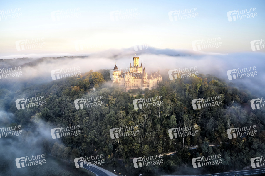 Schloss Marienburg auf dem Marienberg im Morgennebel. (Bildfreigabe durch Pressesprecherin Annette Langhorst vom Schloss Marienburg) Nordstemmen, 09.10.2021