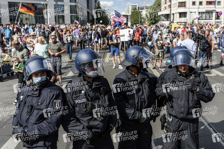 Coronaleugner, Verschwörungstheoretiker und rechte Gruppen der Initiative Querdenken protestieren mit einer Großdemonstration gegen die bestehenden Maßnahmen zur Eindämmung der Corona-Pandemie. Wegen Nichteinhaltung der polizeilichen Auflagen wurde die Demonstration durch die Polizei beendet. Berlin, 29.08.2020
