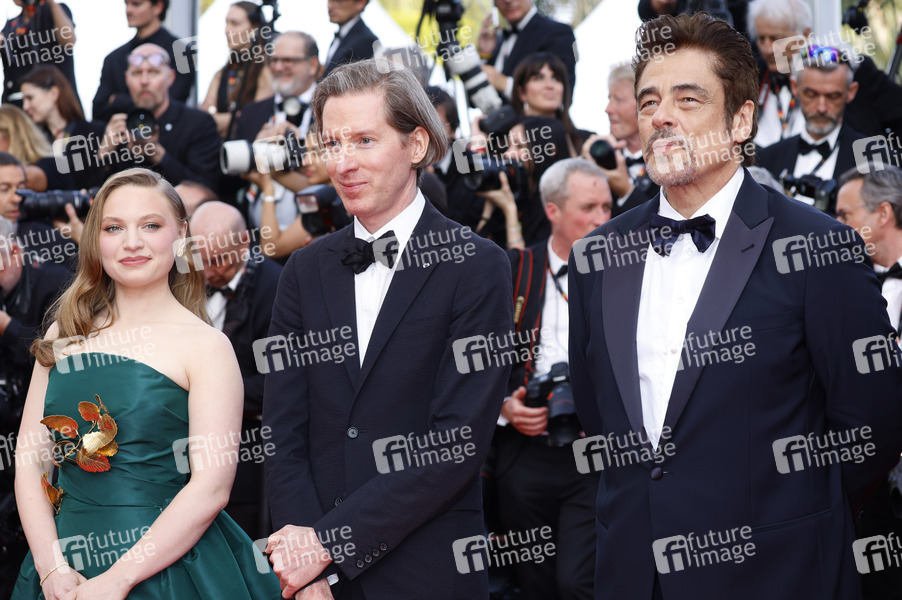 Mia Threapleton, Wes Anderson und Benicio del Toro bei der Premiere des Kinofilms 'The Phoenician Scheme / Der phönizische Meisterstreich' auf dem Festival de Cannes 2025 / 78. Internationale Filmfestspiele von Cannes im Palais des Festivals. Cannes, 18.05.2025