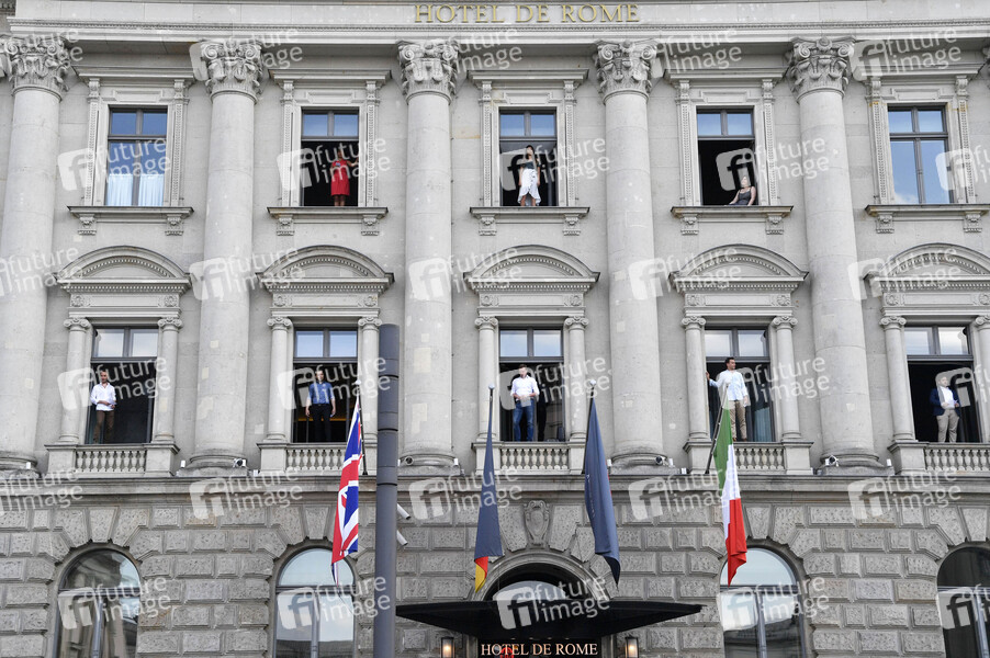 Hotel de Rome Wiedereröffnung mit Mitgliedern des Internationalen Opernstudios der Staatsoper Unter den Linden, welche aus den Fenstern des Hotels mit Renato Rascels 'Arrivederci, Roma' und Paul Linckes 'Berliner Luft' den Bebelplatz zum Klingen bringen. Berlin, 17.06.2020
