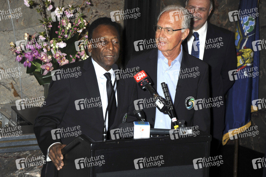 New York Cosmos Fußball-Legenden Pele und Franz Beckenbauer beim Einschalten des 'Cosmos-grünen' Lichts am Empire State Building zum Start der Fußball Spielsaison 2015. New York, 17.04.2015