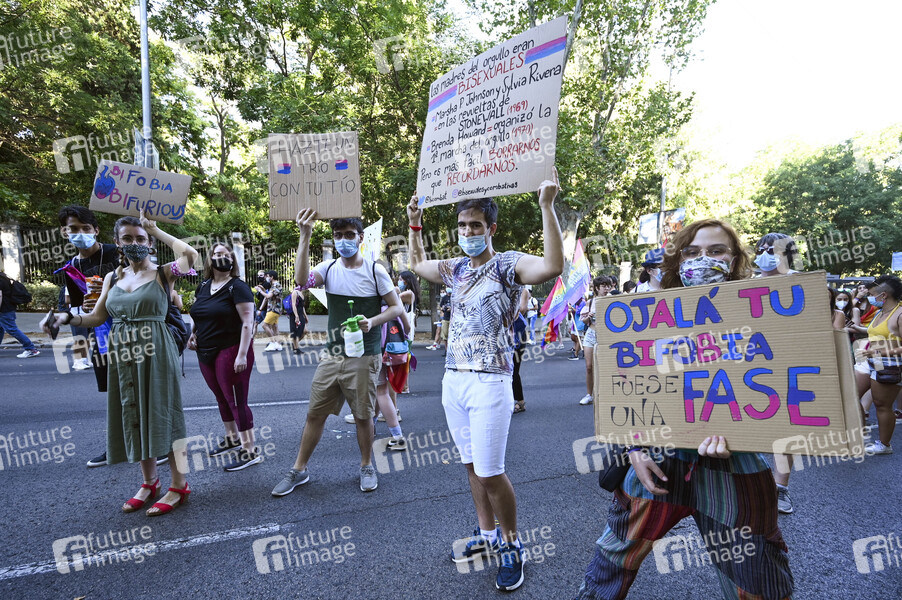 Wegen der Coronakrise nimmt die LGBT-Community viele ihrer Veranstaltungen online wahr. Etliche Aktivisten gingen trotzdem zur Guia del Orgullo LGTBI / Gay Pride Parade 2020 auf die Straße. Madrid, 28.06.2020