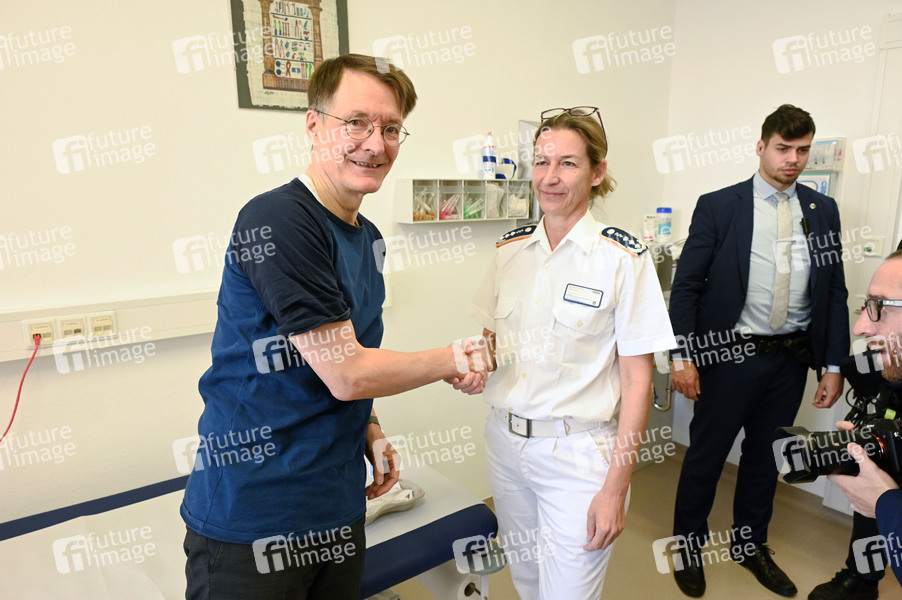 Karl Lauterbach lässt sich von Oberstarzt Dr. med. Nicole Müller gemäß STIKO-Empfehlung gegen Influenza und COVID-19 im Bundeswehrkrankenhaus impfen. Berlin, 16.10.2024