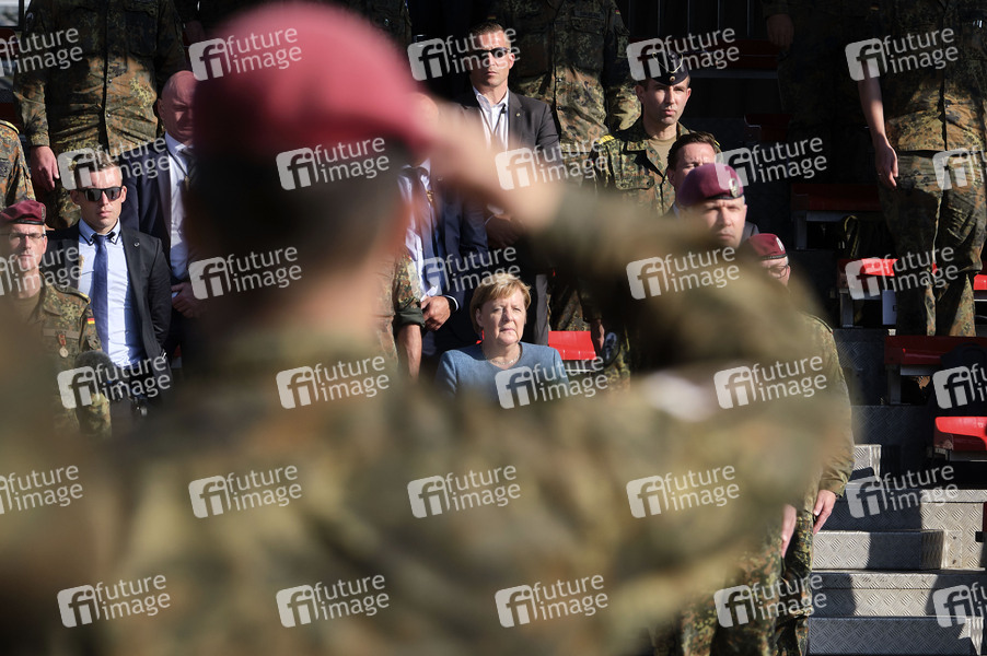 Bundeskanzlerin Angela Merkel bei einem Appell für die Soldatinnen und Soldaten der Evakuierungsmission in Kabul und dem Feierlichen Gelöbnis von Rekruten des Fallschirmjägerregiments 31 in der Fallschirmjägerkaserne Seedorf. Seedorf, 22.09.2021