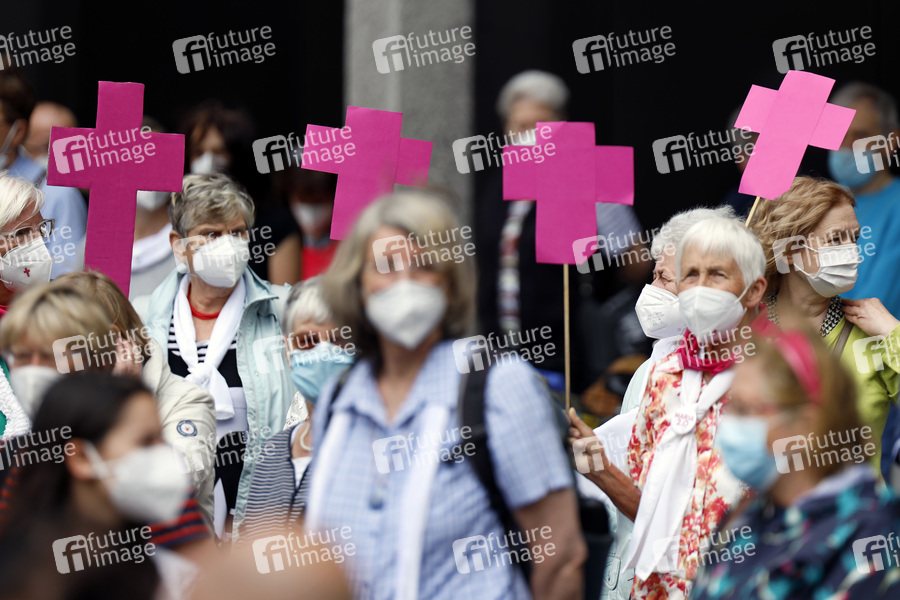 Bei einer Kundgebung auf dem Börsenplatz kritisieren Gläubige aus dem Erzbistum Köln und Aktivisten der Bewegung Maria 2.0 das Verhalten der Kirche und Erzbischof Rainer Maria Kardinal Woelki bei der Aufarbeitung des Missbrauchskandal. Am Nachmittag trifft auch eine Pilgergruppe von Pfarrer Klaus Koltermann aus Dormagen Nievenheim mit 60 Christen nach 40 Km Fußmarsch unter dme Motto 'Aufbruch nach Köln' auf dem Börsenplatz ein. Koltermann hat sich als einziger Pfarrer in Deutschland für den Rücktritt von Kardinal Woelki ausgesprochen. Köln, 12.06.2021