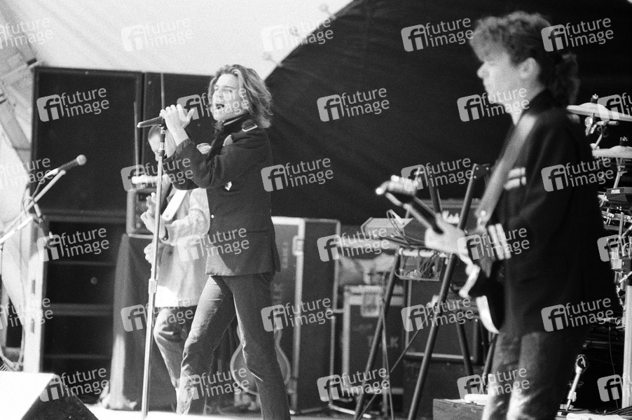 Kirk Pengilly, Michael Hutchence und Tim Farriss von INXS live beim Stadtpark Open Air 1986 auf der Stadtpark Freilichtbühne. Hamburg, 22.06.1986
