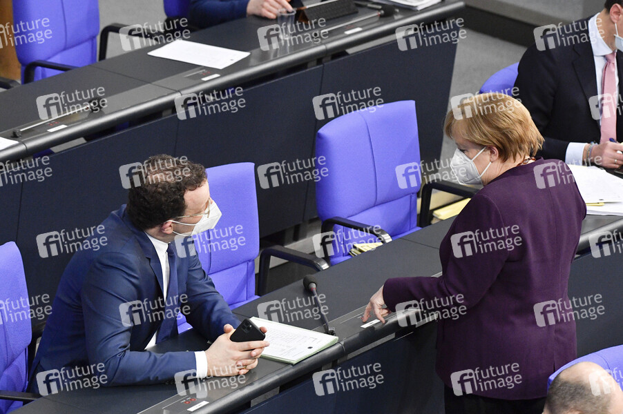 Jens Spahn und Angela Merkel in der 205. Sitzung des Deutschen Bundestages im Reichstagsgebäude. Berlin, 27.01.2021