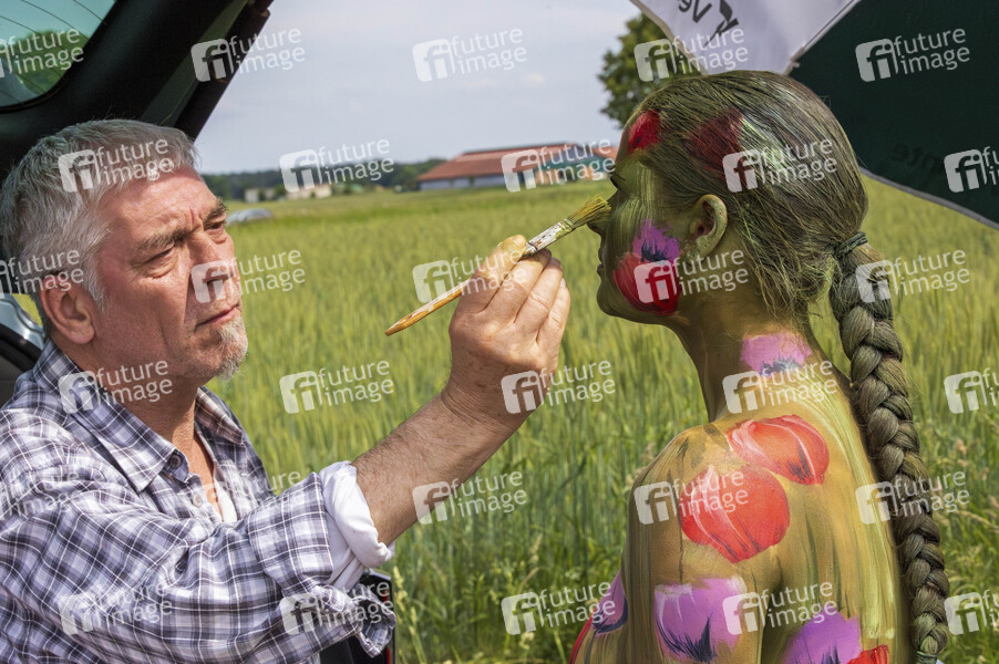 Nature Art: Rotmohn Bodypainting und Photoshooting mit Model Tatjana Heinz in einem Mohnfeld. Eilvese, 13.06.2025 - Bodyart-Künstler: Jörg Düsterwald