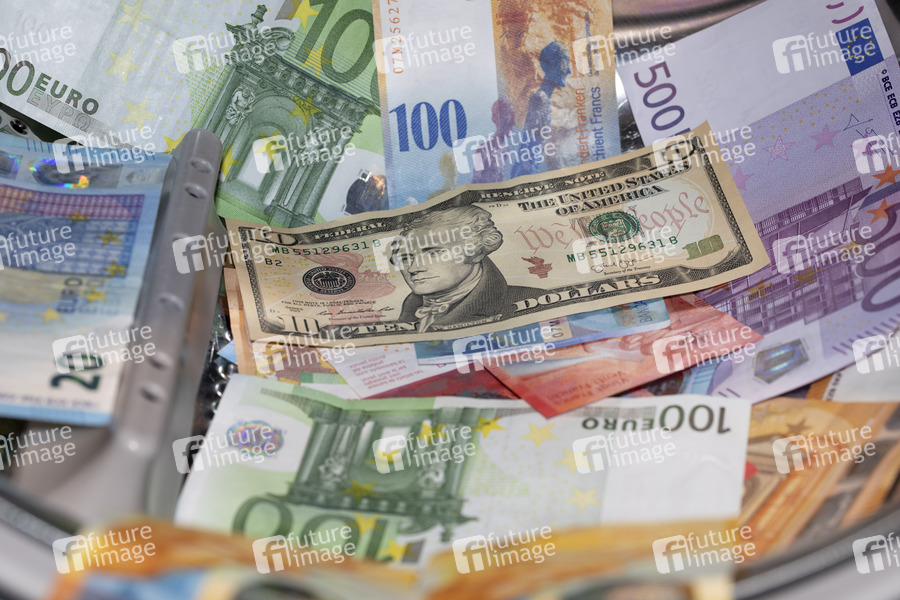 EURO, Schweizer Franken und Dollar Banknoten in einer Waschmaschine