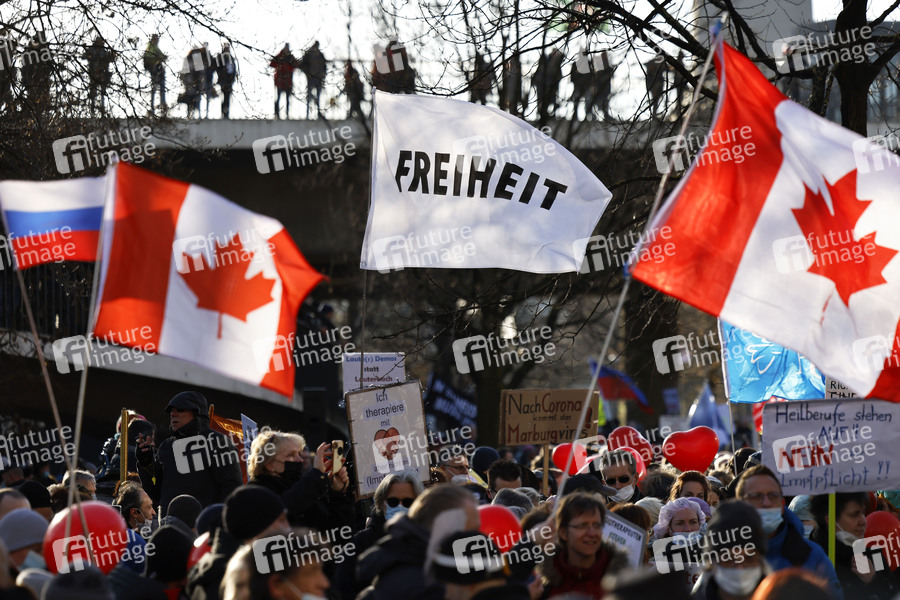 Bei einer angemeldeten Demo unter dem Motto 'Wir alle gemeinsam - Freie Impfentscheidung' demonstrierten etwa 12.000 Gegner einer Impfpflicht mit einem Spaziergang gegen die Corona-Maßnahmen der Bundesregierung und für eine individuelle Impfentscheidung, Grundrechte und 'unversehrte' Kinder - darunter auch viele Pflegekräfte, die wegen der Impfpflicht im Gesundheitsbereich ihren Job zu verlieren drohen. Düsseldorf, 12.02.2022