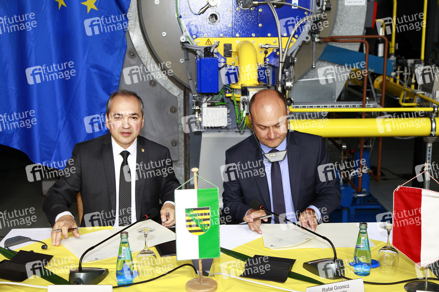 Octavian Ursu und Rafal Gronicz bei der feierlichen Unterzeichnung des Letter of Intent 'Klimaneutrale Fernwärme für die Europastadt Görlitz/Zgorzelec' im BHKW Königshufen. Görlitz, 09.07.2020