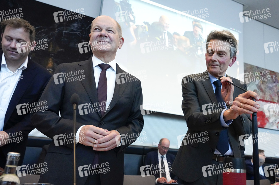 Olaf Scholz und Rolf Mützenich bei der Fraktionssitzung der SPD-Bundestagsfraktion im Reichstagsgebäude. Berlin, 08.10.2024