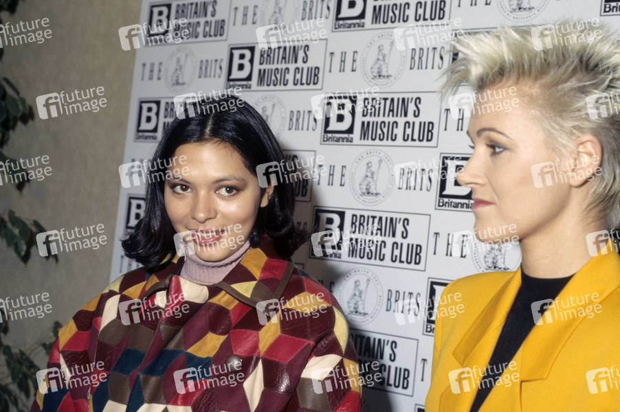 Betty Boo mit Marie Fredriksson von Roxette bei der Pressekonferenz zur Verleihung der BRIT Awards 1991 im St. Georges Hotel. London, 10.12.1990
