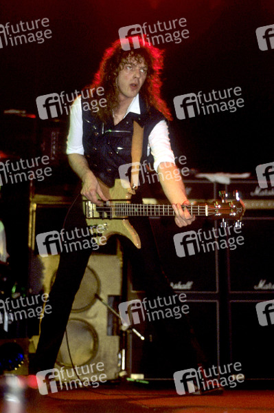 Neil Murray von Whitesnake live bei einem Konzert der 'Slide it in'-Tour in der Wembley Arena. London, 03.03.1984