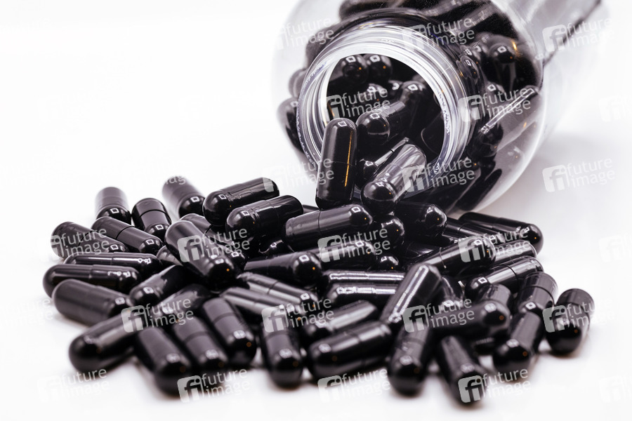 Schwarze Pillen mt Pillenflasche. Köln, 08.05.2019