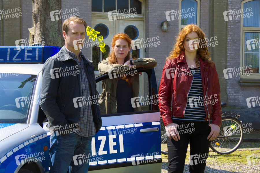 Henny Reents, Hinnerk Schoenemann und Marleen Lohse beim Fototermin am Set das ARD-Krimis 'Nord bei Nordwest' auf dem Flügger Hof. Fehmarn, 20.05.2014