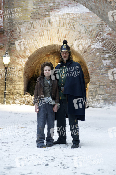 Maximilian Ehrenreich und Oliver Korittke beim Fototermin am Set des Fernsehfilms 'Das Mädchen mit den Schwefelhölzern' aus der ARD-Märchenreihe 'Sechs auf einen Streich' in der Zitadelle Spandau. Berlin, 18.03.2013