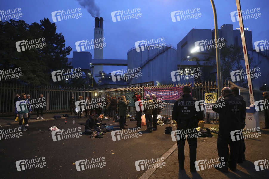 Aktivisten der Umweltschutzgruppe Extinction Rebellion demonstrieren vor dem Vattenfall-Kohlekraftwerk Reuter West. Etwa zehn von ihnen haben sich mit Sekundenkleber am Eingangsgitter festgeklebt. Nach Angaben der Organisatoren handelt es sich um eine schwedische Gruppe XR-Demonstranten. Berlin, 11.10.2019
