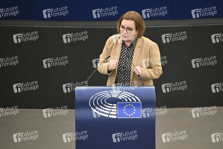 Anna Zalewska bei einer Plenartagung zur Überarbeitung der Marktstabilitätsreserve für den EU-Emissionshandel im Plenarsaal des Europäischen Parlaments. Straßburg, 04.04.2022