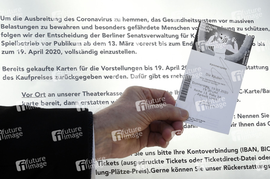 Ein einzelner Besucher gab am Samstag seine Karte für eine Aufführung im Deutschen Theater zurück. Seit Freitag sind die staatlichen Theater-, Opern- und Konzerthäuser komplett geschlossen, genauso wie die Museen, Gedenkstätten und Bibliotheken. Dem Beispiel der staatlichen Kultureinrichtungen folgen auch die meisten private Bühnen. Ab kommender Woche schließen auch Schulen und Kitas. Berlin, 14.03.2020