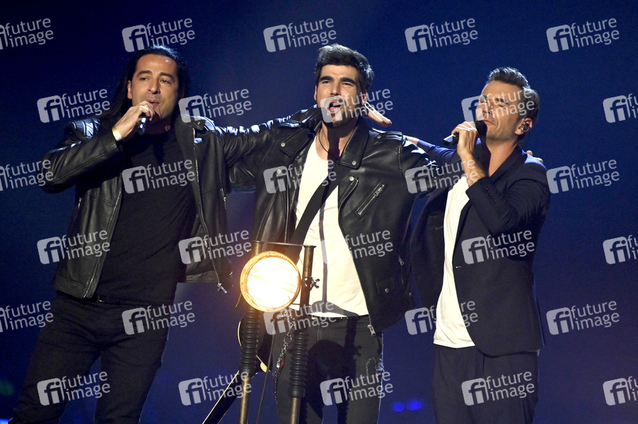 Bülent Ceylan, Martin Goldenbaum (Brenner) und Florian Silbereisen in der TV Show 'Schlagerbooom 2021 - Alles funkelt! Alles glitzert!' in der Dortmunder Westfalenhalle. Dortmund, 23.10.2021