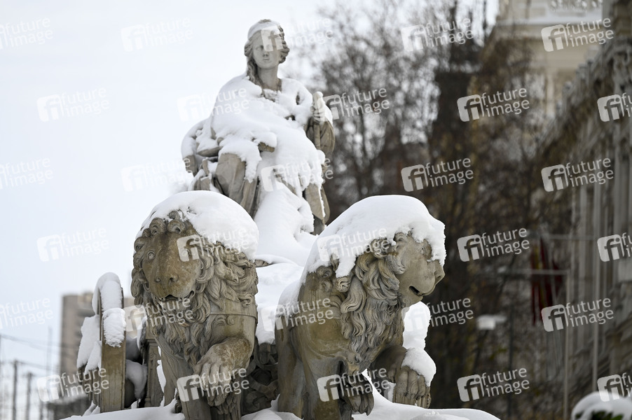 Plaza de Cibeles - Die Region Madrid nach dem Sturmtief Filomena, das in weiten Teilen Spaniens mit starken Schneefällen für Chaos sorgte. Starker Schneefall legte das öffentliche Leben nahezu lahm. Seit 50 Jahren hatte es nicht so geschneit. Madrid, 10.01.2021