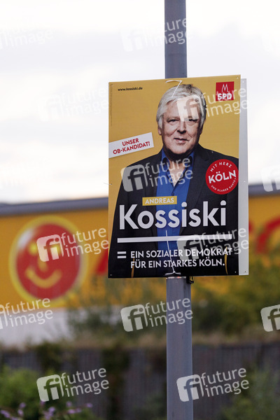 Ein Wahlplakat der SPD mit dem Kandidaten für das Amt des Kölner Oberbürgermeisters Andreas Kossiski für die Kommunalwahl 2020 in NRW hängt an einer Laterne in Köln. Am 13. September 2020 werden in NRW Oberbürgermeister, Landräte, Stadträte und Kreistage neu gewählt. Köln, 03.08.2020
