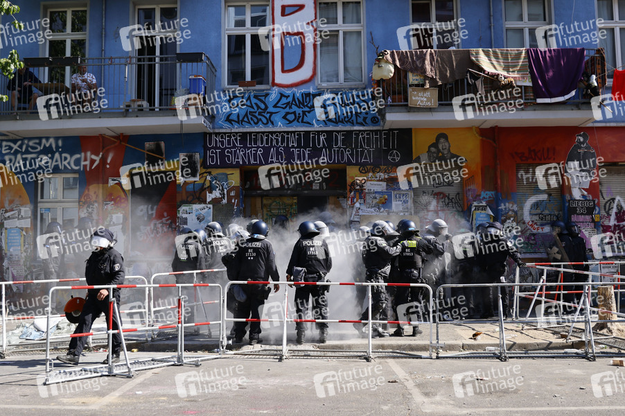 Im teilbesetzten Haus in der Rigaer Straße 94 sollte am Donnerstag der Brandschutz überprüft werden. Nachdem die Bewohner sich zunächst weigerten, die Tür zu öffnen, verschaffte sich die Polizei gewaltsam Zutritt und wurde mit Farbe beworfen. (Quelle: rbb online) Berlin, 17.06.2021