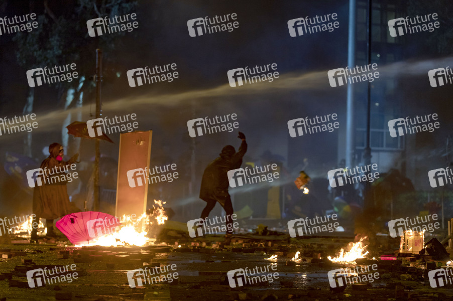 Sudenten wehren sich mit Molovecocktails gegen die Wasserwerfer der Polizei auf der Cheong Wan Road - Belagerung an der Polytechnischen Universität. Die Polizei umstellt den Campus der Universität, nachdem Demonstranten den Cross-Harbor-Tunnel und die Hauptstraße außerhalb des Campus blockiert haben. Hongkong protestiert seit fünf Monaten ununterbrochen. Am Montag, dem 11. November 2019, begann ein Streik in der ganzen Stadt, der Teile von Hongkong zum Erliegen brachte, als MTR-Stationen geschlossen und mehrere Straßensperren errichtet wurden. Hongkong, 18.11.2019