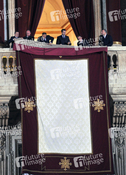 Wahl vom argentinischen Kardinal Jorge Mario Bergoglio zu Papst Fanziskus. Assisten preparieren den Balkon vom Petersdom für den ersten Auftritt von Papst Franziskus. Vatikanstadt, 13.03.2013