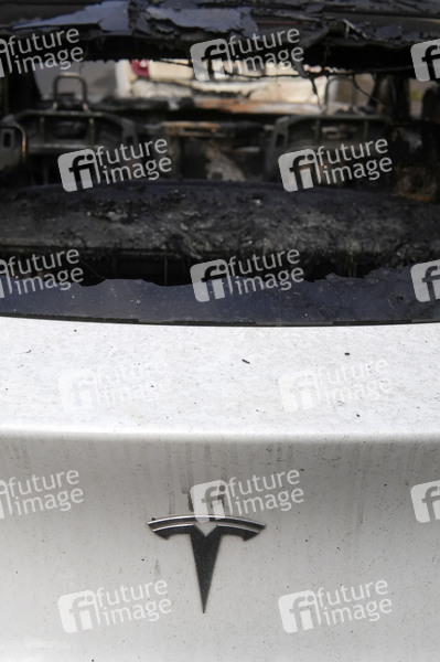 Brand, Feuer, Auto, PKW, Autowrack, Autowracks, Brandstiftung, Fahrzeug, Umweltverschmutzung, Symbolfoto, Symbolbild, Themenfoto, Symbolfoto, Autobrand, Protest gegen Elon Musk