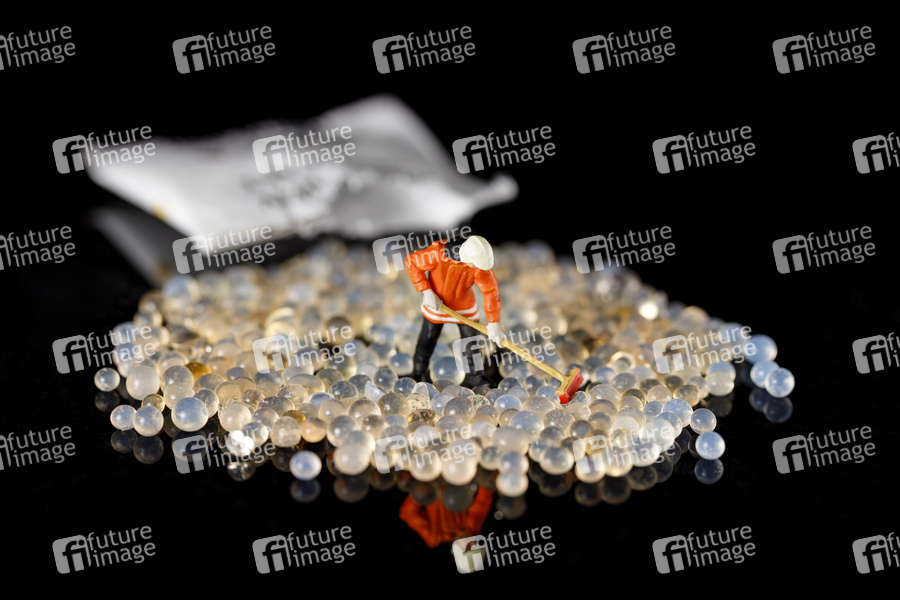 Der Inhalt eines Dry-Pack mit Silica Gel wird von einer Miniaturfigur zusammengekehrt. (Themenbild, Symbolbild)