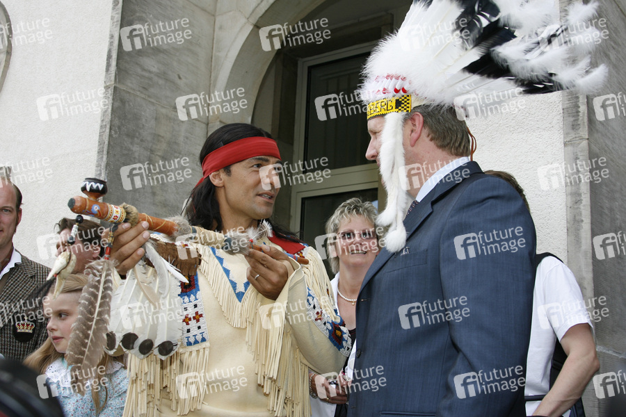 Das Ensemble der Karl-May-Spiele 2009 nimmt Ministerpräsident Wulff in den Kreis der Ehrenhäuptlinge auf. Dazu fanden sich die Mitwirkenden von 'Der Schatz im Silbersee' in der Niedersächsischen Staatskanzlei in Hannover ein.