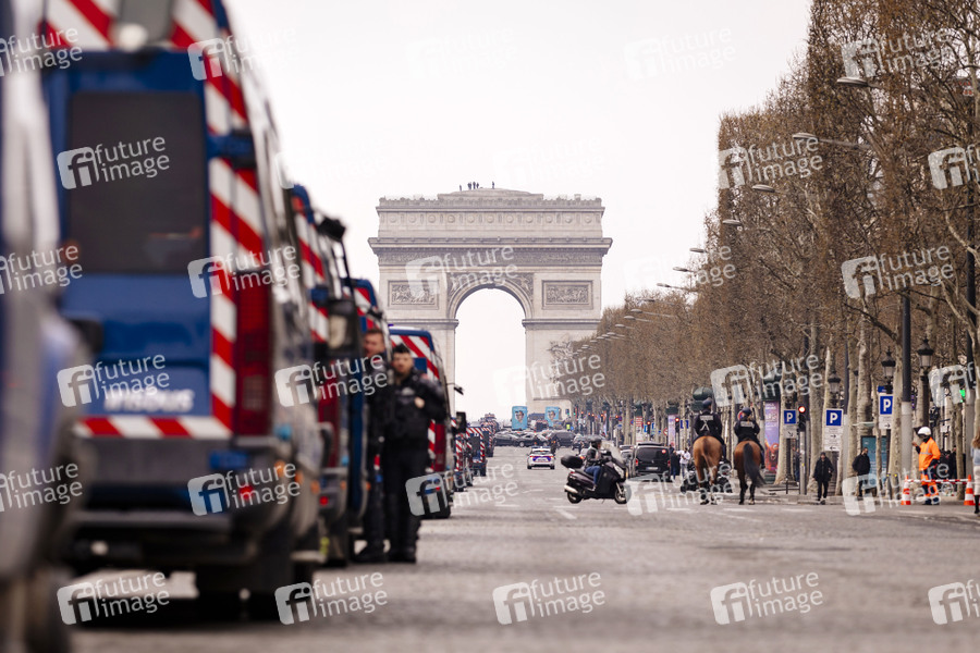 Sicherheitskräfte der französischen Gendarmerie bewachen wichtige Straßen und errichten Checkpoints rund um den Champ Elysees. Paris, 23.03.2019