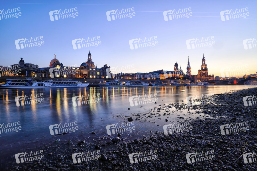 Elbufer mit Blick auf die Frauenkirche, Kathedrale, Dresdener Schloss und Augustusbrücke. Dresden, 30.10.2021
