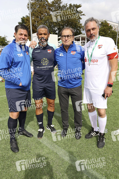 Tim Mälzer, Michél Mazingu-Dinzey, Ewald Lienen und Thomas Mir beim Benefiz-Fußballspiel 'Kicken mit Herz' 2023 zu Gunsten des Herzzentrums des UKE im Stadiun Hoheluft. Hamburg, 03.09.2023