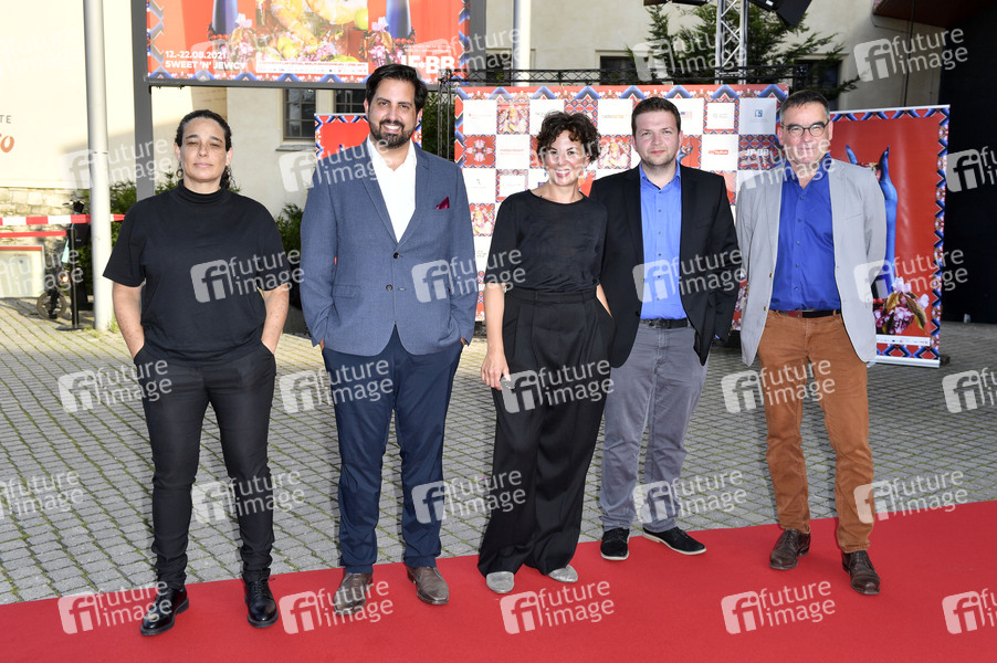 Naomi Levari, Amos Geva, Lea Wohl von Haselberg, Arkadij Khaet und Bernd Buder bei der Eröffnung des 27. Jüdischen Filmfestivals Berlin & Brandenburg im Hans Otto Theater. Potsdam, 12.08.2021