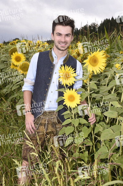 Entertainment, Prominenz, Celebrities, Celebrity, Homestory, Musiker, Akkordeonspieler, Sänger, Nachwuchskünstler in der volkstümlichen Musik, Schwarzhof, Bauernhof, Sonnenblumen, Sonnenblumenfeld