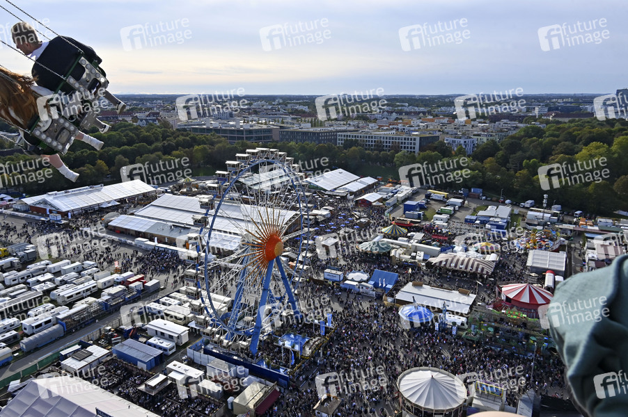 Kettenkarussell in Form eines überdimensionalen Maibaums, Feature, Unterhaltung, Entertainment, Kultur, Fest, Volksfest, 189. Wiesn, Wies'n, Fahrgeschäft, Vergnügungsattraktion, Schausteller, Festzelt, Festzelte, Vergnügen, Alkohol, Bier, Maß, Alkoholkonsum, Trachten, Brauerei, Brauereien, Gastronomie, Wiesnbesucher, Menschenmassen, Symbolfoto, Symbolbild, Themenbild, Themenfoto