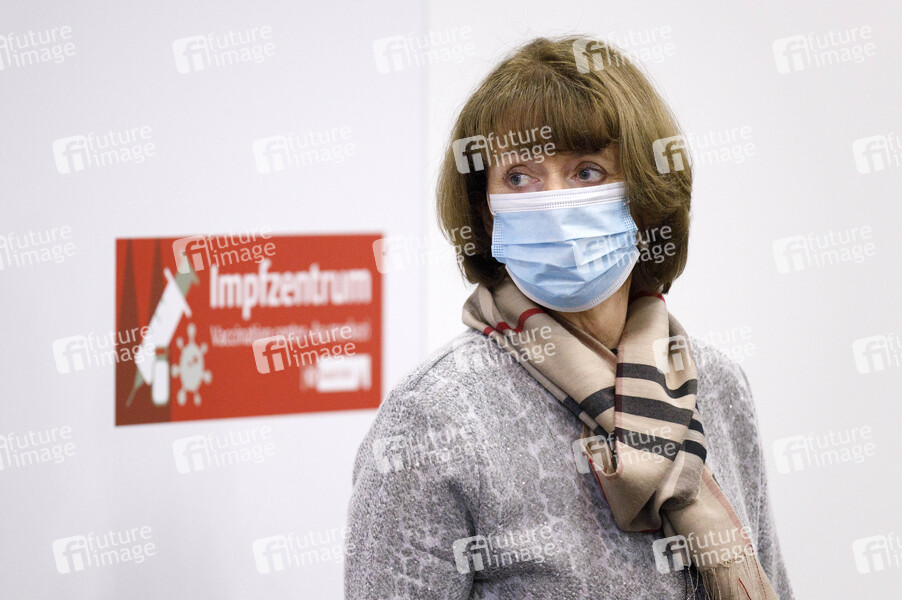 Henrietter Reker auf der Pressekonferenz: Der NRW-Justizminister auf Werbetour in Köln für die Kampagne des Weissen Rings zum Thema 'Kein Anschluss für Betrüger am Telefon' im Impfzentrum in den Messehallen. Auch dort sollen Plakate die alten Menschen vor der Enkeltrick-Masche warnen, die ohnehin die Messehallen für einen Impftermin aufsuchen. Köln, 05.02.2021