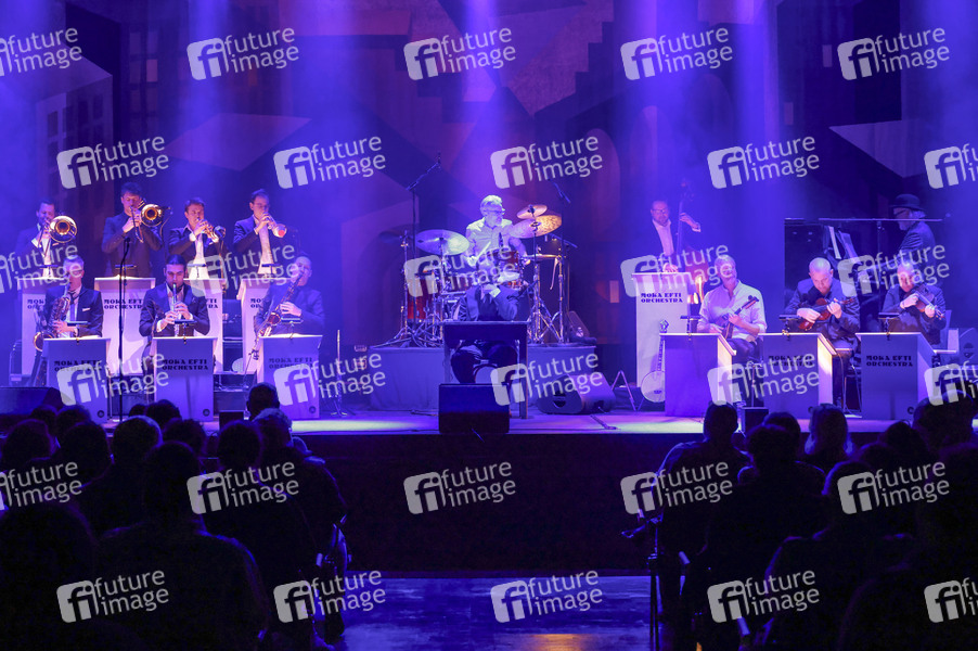 Ulrich Noethen und das Moka Efti Orchestra bei der musikalischen Lesung 'Der nasse Fisch' im Theater am Tanzbrunnen. Köln, 12.03.2025